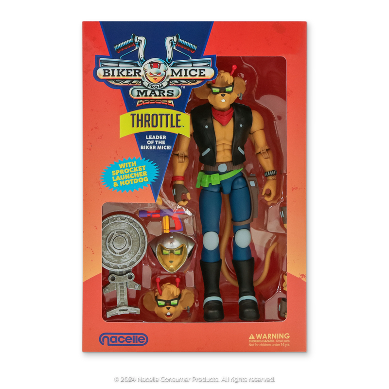 Rev up your engines and get ready to ride with the fearless leader of the Biker Mice From Mars - Throttle! With his trusty sprocket launcher accessory, Throttle is ready to take on the evil forces of Limburger and lead his crew to victory. Standing at just over 7 inches tall, this fully articulated Throttle action figure is a must-have for any true fan of the classic animated series. So, whether you're reliving your childhood memories or discovering the Biker Mice for the first time, this Throttle action figure is sure to be a mind-blowing addition to your collection.